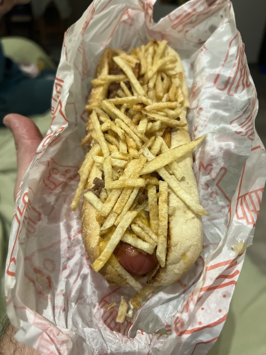 Hot dog con salchicha, carne molida, queso para nachos y papa fosforito.